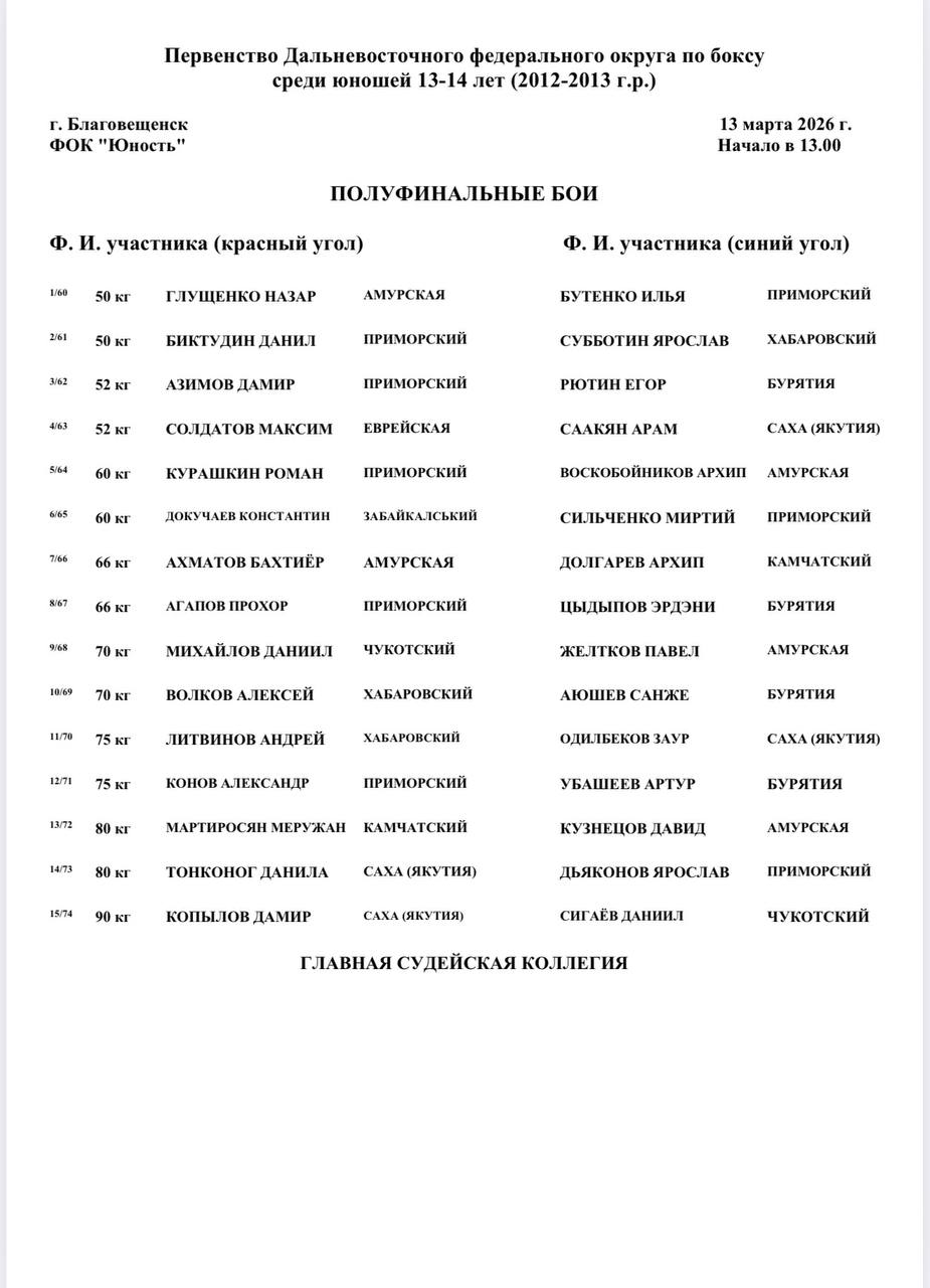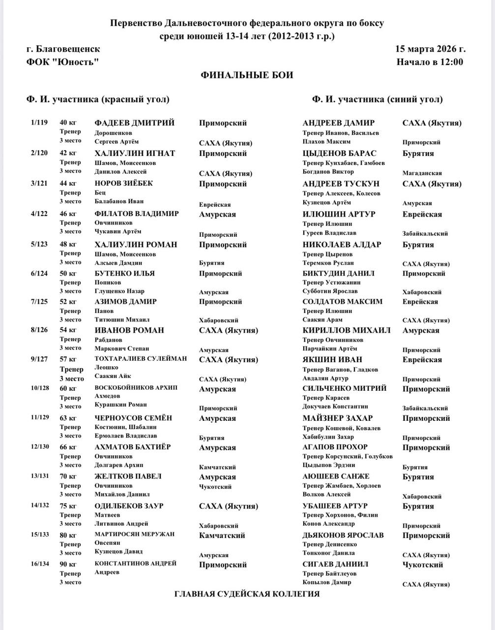 Состав пар и прямая трансляция финального дня Первенства ДФО по боксу среди юношей 13-14 лет.