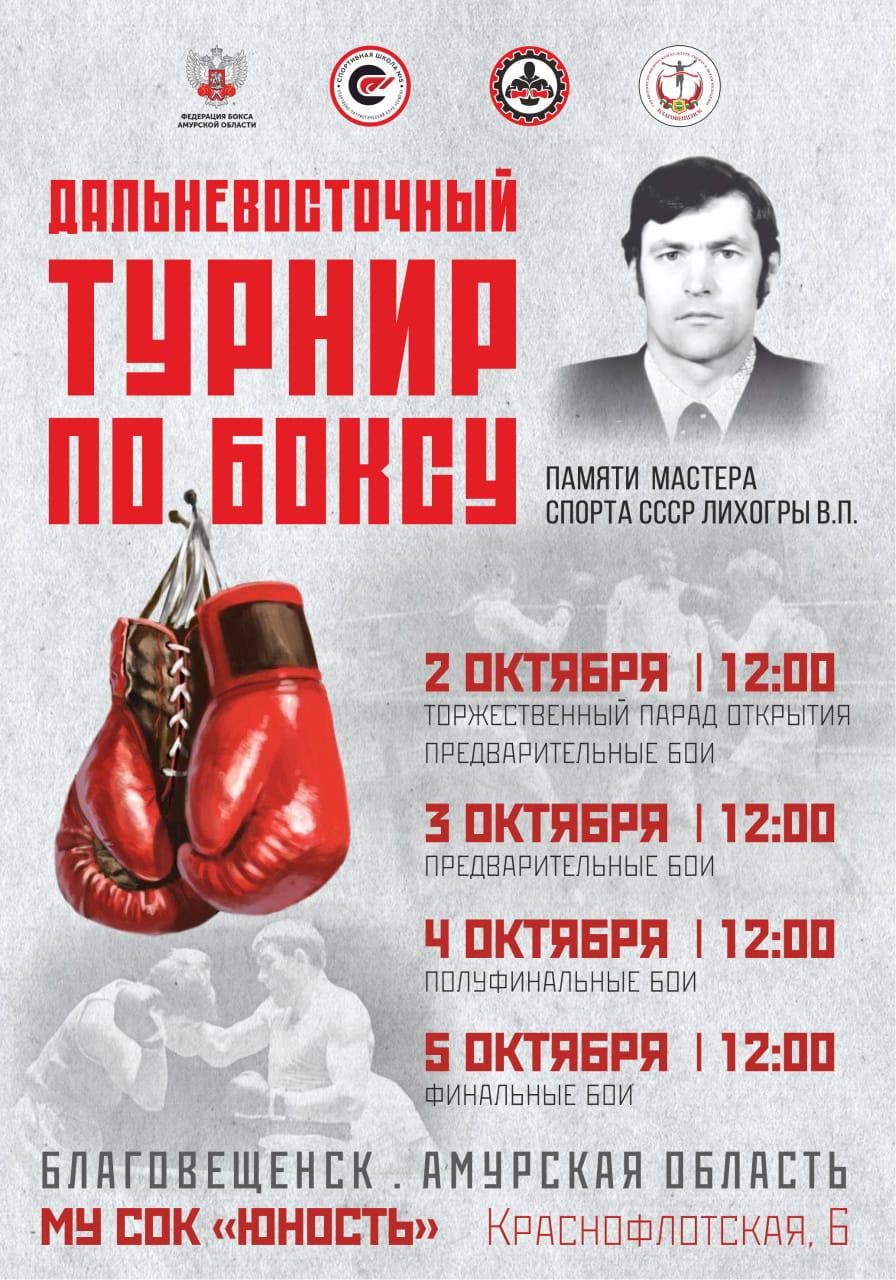 С 2 по 5 октября в Благовещенске по адресу Краснофлотская, 6 МУ СОК «Юность» пройдет Дальневосточный турнир по боксу, посвященный памяти мастера спорта СССР Виктора Лихогры.